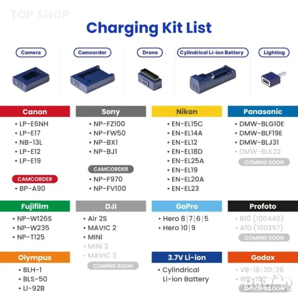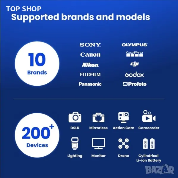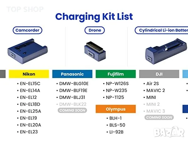* СЪВМЕСТИМОСТ С 10 МАРКИ - Зарядното устройство за фотоапарат с различни марки е съвместимо с 10 марки с над 200 модела