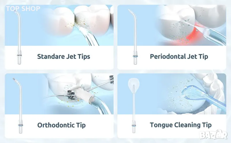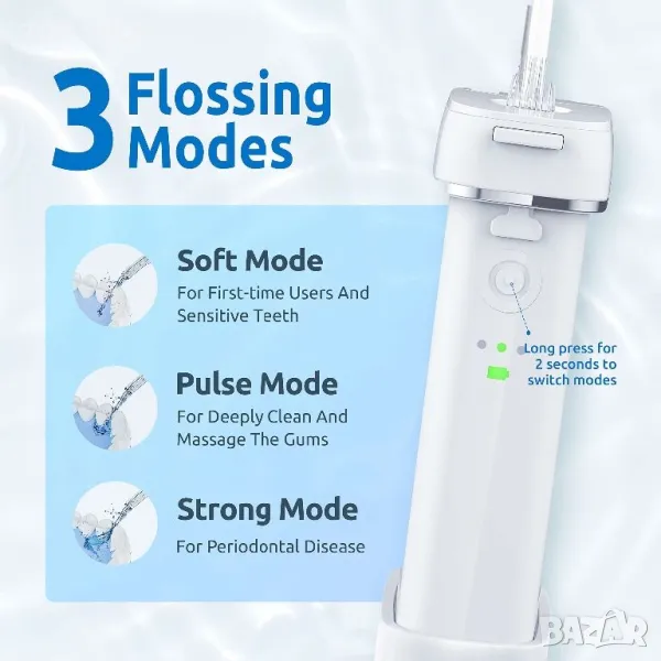 - 3 чисти режима и IPX7 водоустойчив дизайн: Конецът за вода има меки, импулсни, силни режими за избор с дизайн с ниско ниво на шум, който може да отговори на различни нужди за грижа за устната кухина. Водоустойчивостта IPX7 гарантира, че продуктът е безопасен за използване и предотвратява течове.
