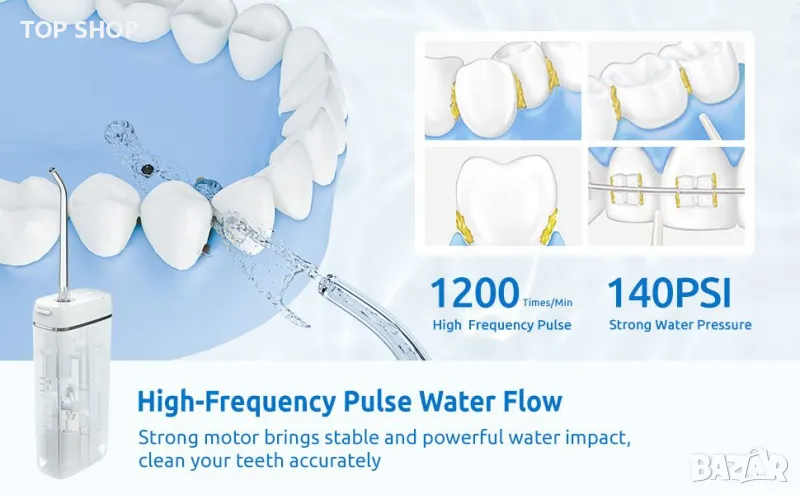 Обем на резервоара: 140мл Включен пакет: SYNHOPE Water Flosser x 1, резервни струйни дюзи x4, USB кабел x 1, ръководство за употреба x 1. Потърсете B09712KM1Q, ако имате нужда от още резервни дюзи Изпращаме по Спиди и Еконт с преглед и тест.
