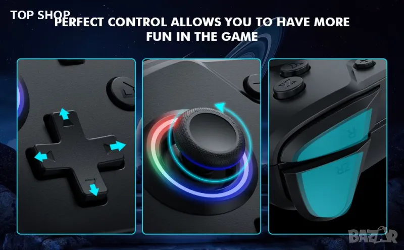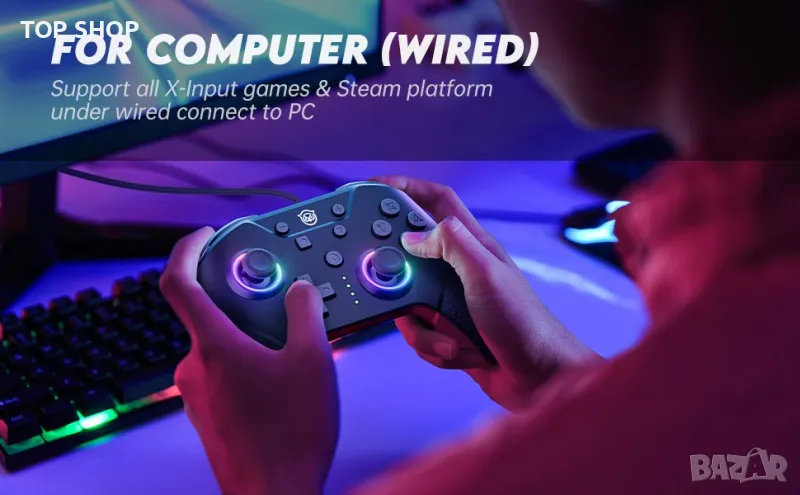 Геймпадът има вградени двойни мотори, които поддържат 4 нива на регулиране на вибрациите и приема 6-осов жироскопичен сензор за постигане на прецизен контрол на движението, подобрявайки вашето игрово изживяване и позволявайки ви да се потопите в игра.