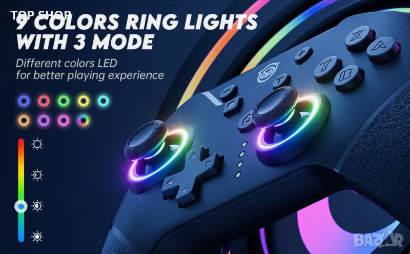 Дистанционното управление NYXI има 9 цвята светлини и 3 режима на осветяване и поддържа 4 нива на регулиране на яркостта. Регулирайте цвета/яркостта на контролера за по-добро игрово изживяване в различни игри.