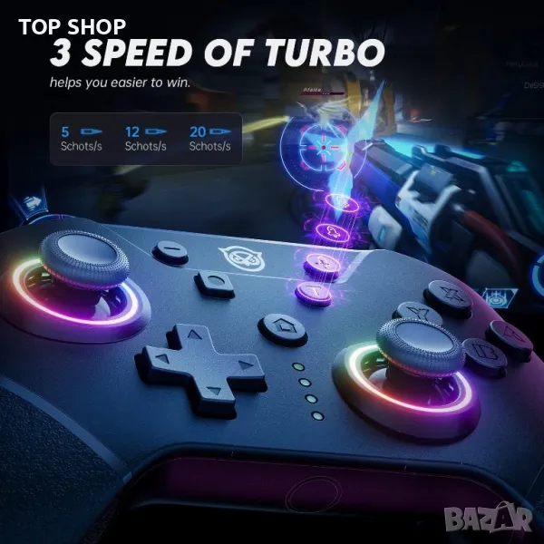 Акумулаторният геймпад поддържа 3-степенно регулиране на турбо режима (5/12/20 пъти/секунда) и може да зададе A/B/X/Y/L/R/ZL/ZL/ZR автоматична турбо функция, което го прави по-лесно за вас да спечелите в стрелба и бойни игри.