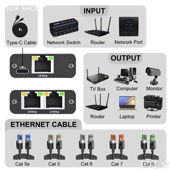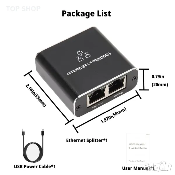 ОПИСАНИЕ - Ethernet сплитер: Този Gigabit Ethernet сплитер е проектиран да решава проблеми с връзката, причинени от недостатъчно окабеляване. Захранван от включения USB 1 м кабел, той поддържа два компютъра за споделяне на Ethernet линия едновременно. Това е прост и ефективен мрежов сплитер, който ви помага да разширите мрежовите си портове