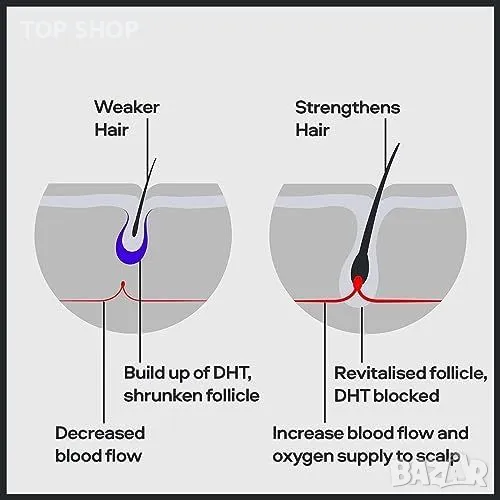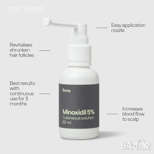 Minoxidil 5% решение: Стимулира фоликулите за плътна и силна коса.