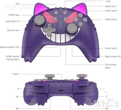 Съдържание на пакета: 1 Purple Devil Switch контролер, 1 Type C кабел за зареждане и подробни инструкции.