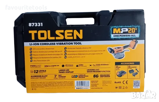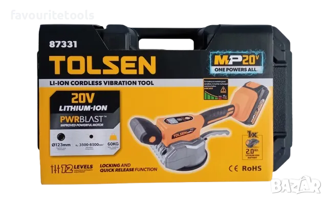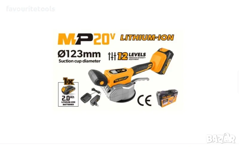Предлагам чисто нова акумулаторна вибрираща вендуза за плочки Tolsen 20V. Предимството на този инструмент се състои в по-лесното нивелиране на големи и тежки плочи.