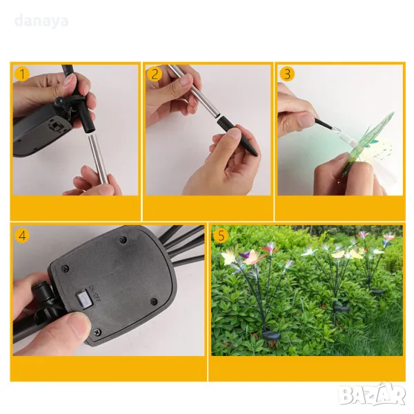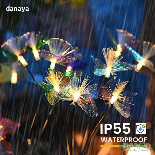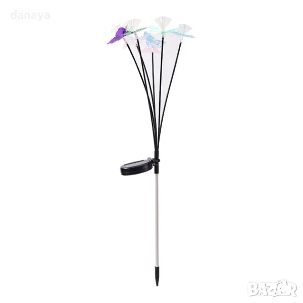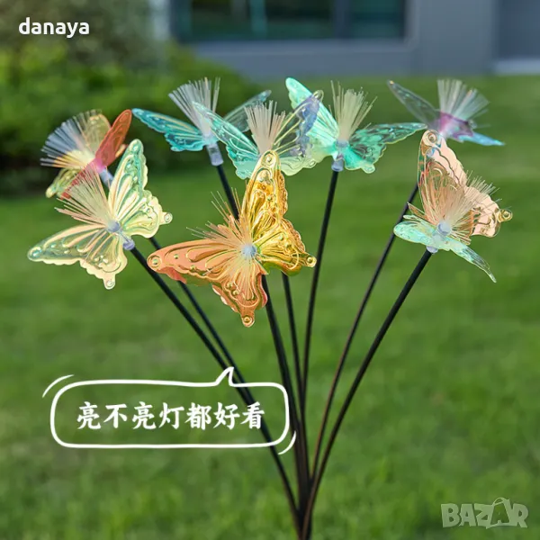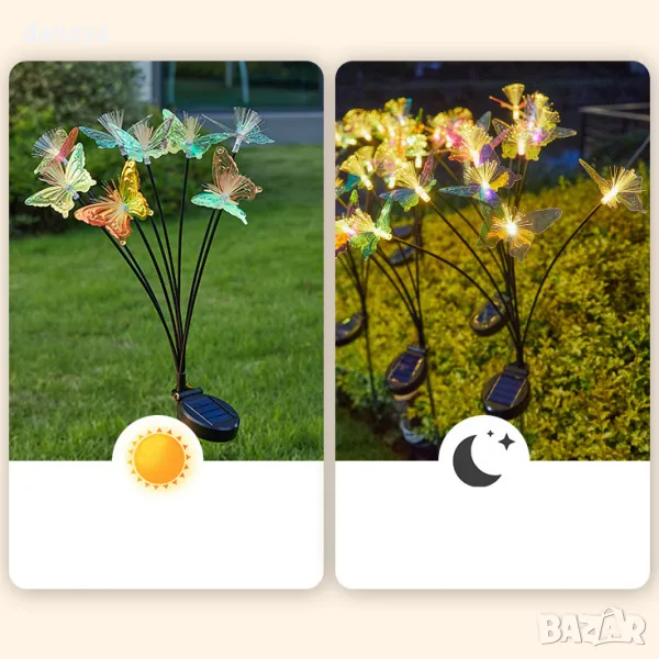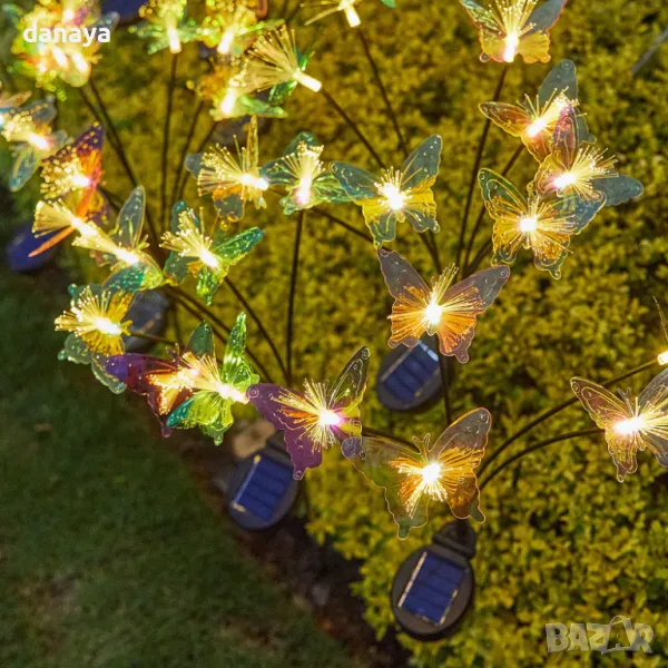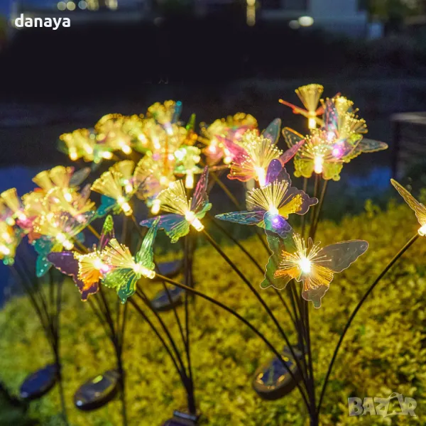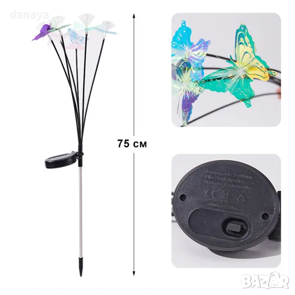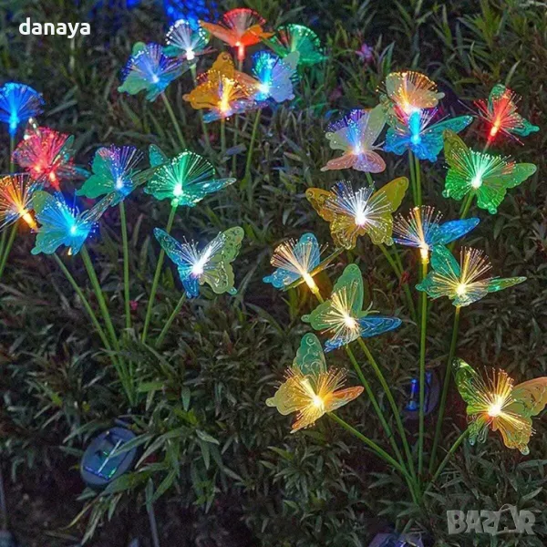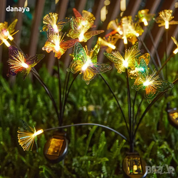 Соларна лампа за градинска декорация и украса. Представлява букет от 6 броя лампички пеперудки, които светят в мека жълта светлина. Захранват се от соларен панел. Ефектното при този модел е, че когато вятърът ги полюшва, те създават невероятен светлинен ефект. Уникална LED декорация за градина, която имитира люлеещи се пеперуди. Те имат соларен панел и светят в мека жълта светлина. Тези 6 броя светещи пеперуди са чудесна декорация, подходяща за градина, балкон, тераса, веранда, където да се полюшват небрежно и същевременно феерично. Зареждането им от слънчевата светлина прави лед лампичките енергоспестяващи и екологични.