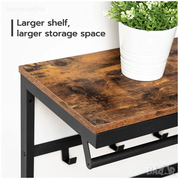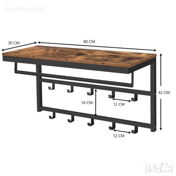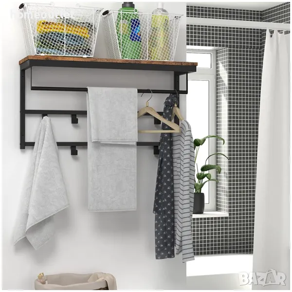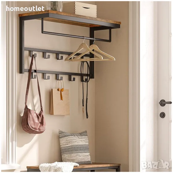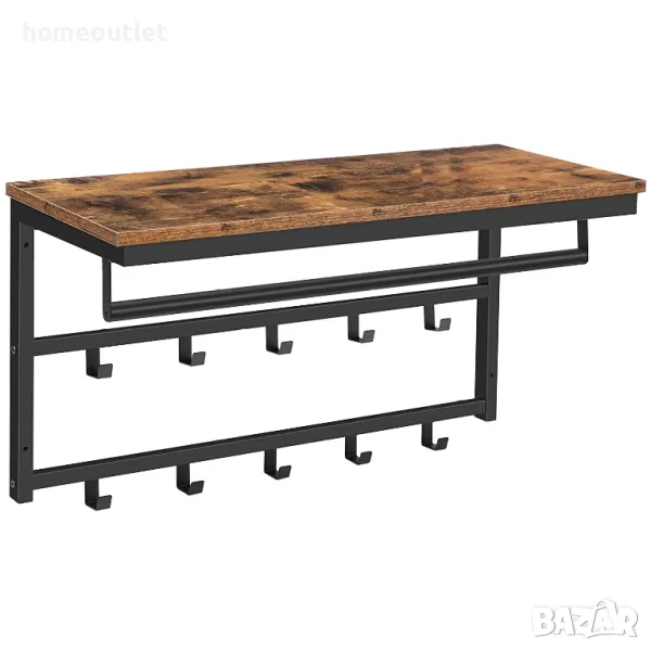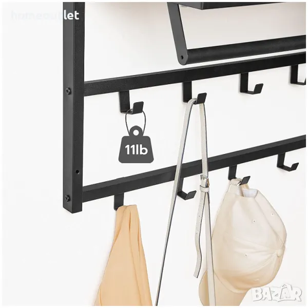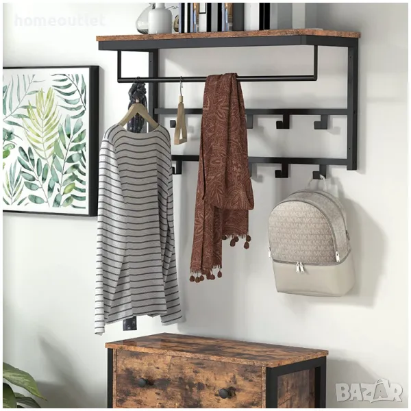 Стенната закачалка съчетава рафт (66 x 30 см), прът за окачване и 2 нива с по 5 куки, за да отговори на различните ви нужди, като същевременно заема малко място.