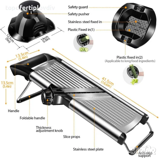 Безопасен за използване и лесен за почистване: Можете да използвате включената четка за почистване и неплъзгащи се гумени крачета. Зеленчукорезачката Mandolin може лесно да се почисти, като просто я поставите в мивка. С четката за почистване остатъците от храна могат да бъдат напълно отстранени.
