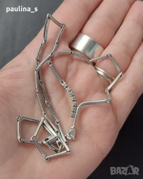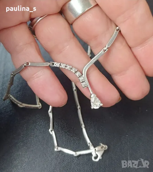 2. Винтидж / Разкошно сребърно колие тип чокър с циркони / проба 925. Цената е крайна 169,99лв. Масивно сребърно колие тип чокър с полутвърда верига и педантив с вковани циркони. Налични няколко маркировки, дължина 45см. На живо е хипнотично красиво. Стои много елегантно. Не се продава на грамаж! Има антикварна стойност и цена! Мащабирането е на дланта.