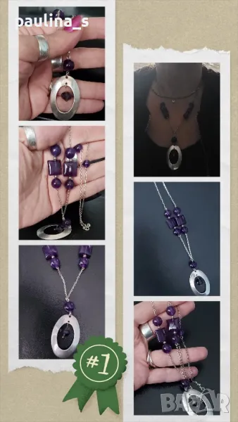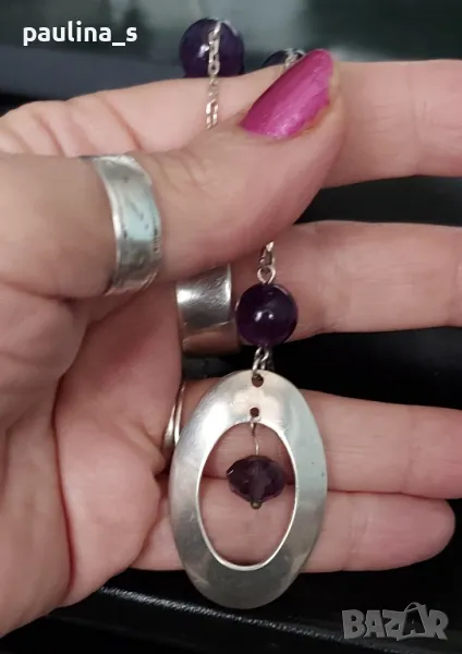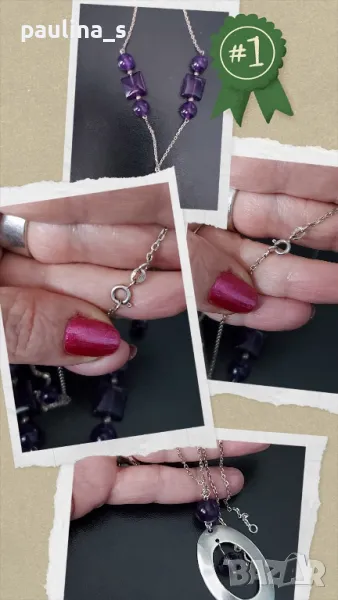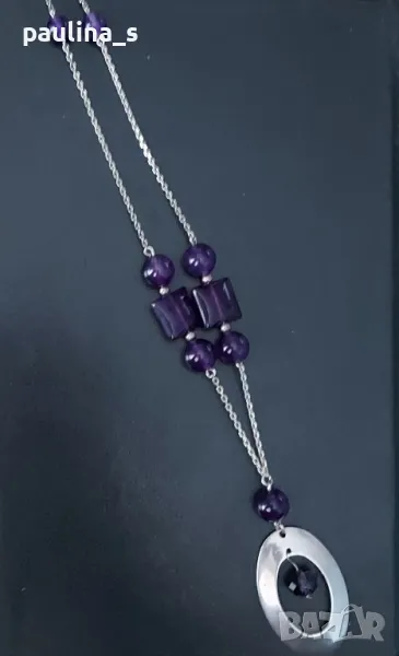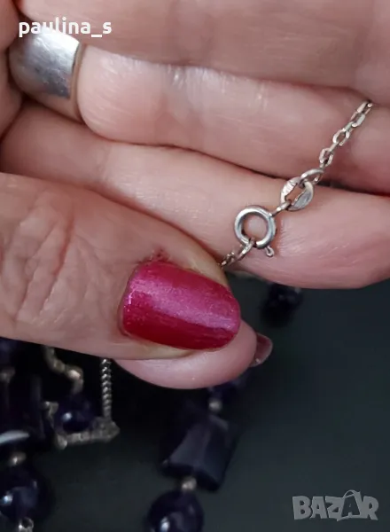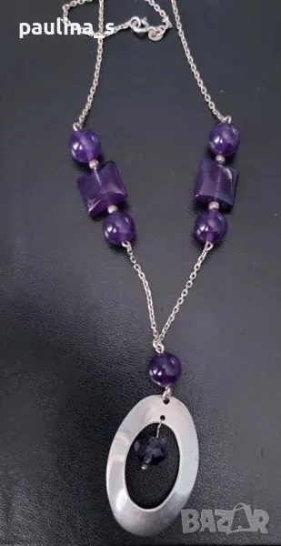 сребърно колие с орнаменти от пурпурни Аметисти. Проба 925 Italy. Цената е крайна 144,99лв. Не е носено, не се продава на грамаж! Дължината е 50см. Мащабирането е на дланта.