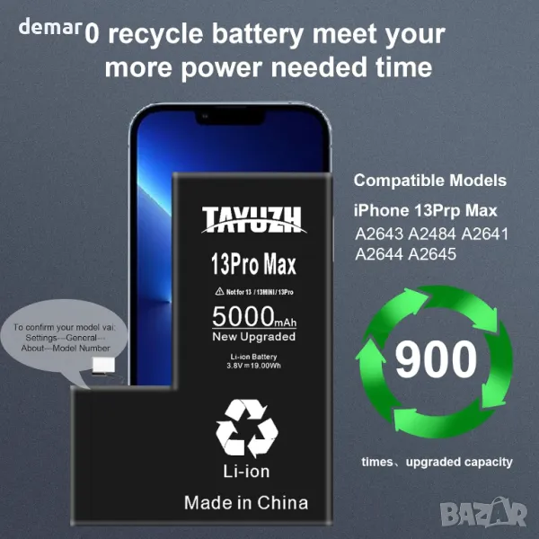 Съвместима с iPhone 13 Pro Max (A2645, A2644, A2643, A2641, A2484), не е за други модели. Разполага с висок капацитет от 5000mAh, предлагаща повече мощност от оригинала, издържаща до 1000 цикъла на зареждане. Създадена с батерийни клетки клас A+ за високоскоростно, ефективно зареждане и множество предпазни защити срещу презареждане, прегряване и късо съединение. За най-добра производителност следвайте указанията за инсталиране и изпълнете 3 до 5 цикъла на пълно зареждане за оптимален живот на батерията. Използвайте с оригиналното зарядно за най-добри резултати.