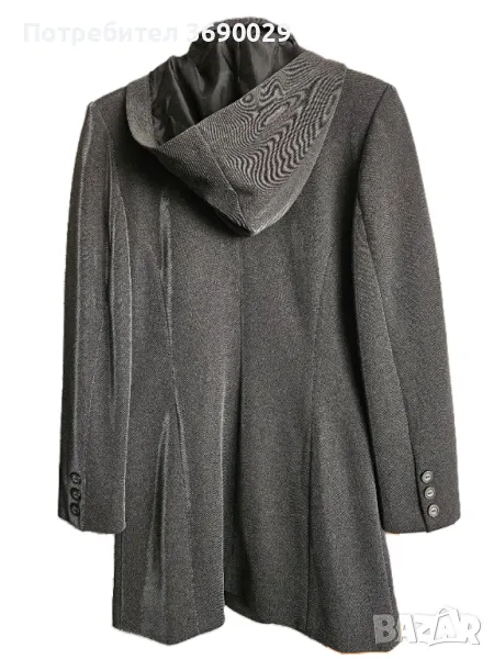 Сив елегантен костюм, с дълго сако с качулка, с възможност да се маха. Прав панталон. Състав - вискоза.