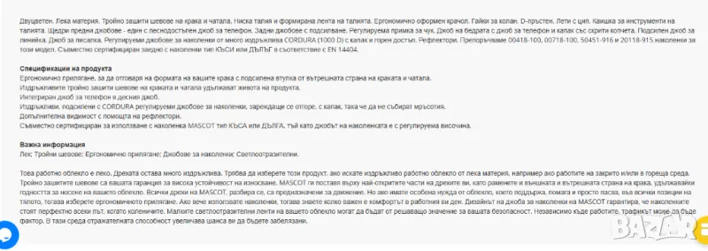 работно облекло е леко. Дрехата остава много издръжлива. Трябва да изберете този продукт, ако искате издръжливо работно облекло от лека материя, например ако работите на закрито и/или в гореща среда. Тройно зашитите шевове са вашата гаранция за висока устойчивост на износване. MASCOT ги поставя върху най-откритите части на дрехите ви, като раменете и външната и вътрешната страна на крака, удължавайки годността за носене на вашето облекло. Всички дрехи на MASCOT, разбира се, са предназначени за движение. Но ако имате особена нужда от облекло, което поддържа, помага и просто пасва, във всички позиции на тялото, тогава изберете ергономичното прилягане. Ако вече използвате наколенки, тогава знаете колко важен е комфортът в работния ви ден. Дизайнът на джоба за наколенки на MASCOT гарантира, че наколенките стоят перфектно всеки път, когато коленичите. Малките светлоотразителни ленти на вашето облекло могат да бъдат от решаващо значение за вашата безопасност. Независимо къде работите, трафикът може да бъде фактор. В тази среда отражателната способност увеличава шанса ви да бъдете забелязани.