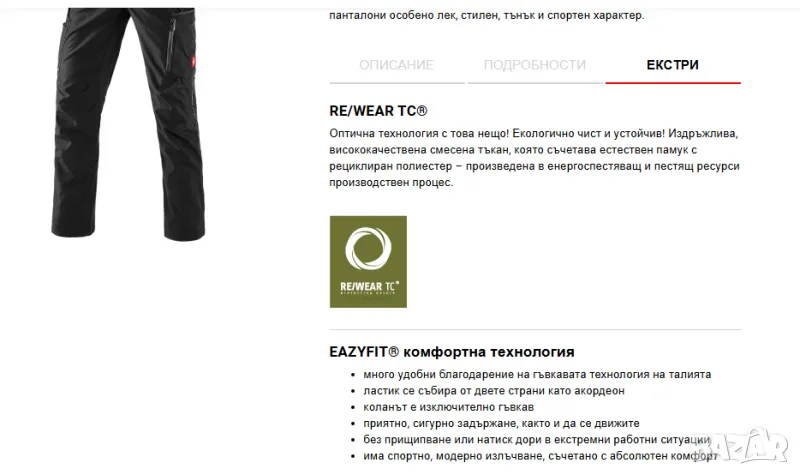 Нашата визия: перфектният баланс работа-комфорт! Интелигентната комбинация от материали на нашите панталони esvision съчетава издръжливост и екстремен комфорт - устойчиво, тъй като облеклата RE/WEAR TC ® са изработени от издръжлива смес от тъкани, включваща естествен памук и рециклиран полиестер, който е произведен в процес, който пести енергия и ресурси. Намаляването също е името на играта и в други области: сдържаният дизайн на джобовете придава на тези панталони особено лек, стилен, тънък и спортен характер.
