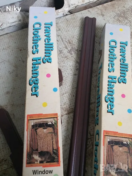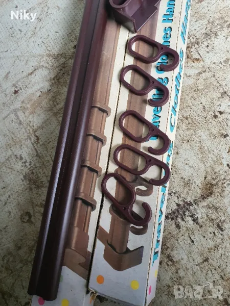 Закачалка за дрехи "Removable wardrobe" (Подвижен гардероб), за която не са нужни пирони и винтове. Много е удобна при пътуване защото лесно може да се окачва на врата, прозорец, в баня и други места. Дължина на закачалката 59 см, а на страничните куки 12, 5 см. Нови, в оригинални кутии .