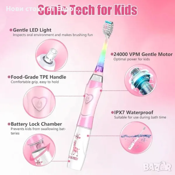 Детска електрическа четка за зъби за малки деца на възраст 2-4-8-12 години Електрическа четка за зъби за момичета с таймер Arc LED светеща вибрираща четка за зъби с батерии за деца Звукова четка за зъби (розов жираф)За деца на възраст 2-12 години: Тази електрическа четка за зъби за деца е оборудвана с 24 000 VPM A+ мотор, който осигурява нежни, но високочестотни звукови вибрации, подходящи за деца на възраст 2-12 години. Косъмчетата имат закръгленост над 90%, предпазвайки устата им от порязвания и кървене. Ефективно предотвратява плака и кариес, с ефективност на почистване 3,5 пъти по-висока от ръчните четки за зъби. Функцията Rainbow Light и изживяването от оралния масаж правят четкането забавно: Дискомфортът от четкането може да накара децата да му устоят, но тази детска електрическа четка за зъби използва нежна звукова вибрация, съчетана с ултракръгли влакна, за да осигури удобно изживяване при орален масаж. Дръжката е със сладък дизайн на жираф, а четката за зъби е оборудвана с режим на дъгова светлина. Меките и цветни светлини танцуват в устата на детето, превръщайки четкането в радостна игра. Троен безопасен дизайн за млечни зъби и преходни периоди: Електрическата четка за зъби на Dada-Tech за деца е изработена от хранителни ABS и TPE материали. Косъмчетата са подсилени с техника за сгъване на медна тел и подсилени телчета DuPont, за да се предотврати проливането. Долният капак е запечатан, за да се предотврати случайно поглъщане. Дръжката се отличава с неплъзгащ се материал без BPA с гладък и заоблен дизайн, което я прави идеалният подарък за деца. LED светлина за прецизност, специални влакна за ефективно почистване: Тази детска електрическа четка за зъби е оборудвана с тестов режим на бяла LED светлина, който помага на родителите точно да локализират остатъците от храна и плаката. Меките влакна с диаметър 0,127 mm и над 90% заоблени ръбове (A+ индустриален стандарт) прилягат плътно към повърхностите на детските зъби, комбинирани с високоефективен ултразвуков мотор, подобряват ефективността на почистване с най-малко 25% и комфорта с 45% в сравнение с нормалните влакна. Култивиране на добри навици за четкане: Следвайки метода на четвъртинно четкане, препоръчан от експертите на ADA, детската електрическа четка за зъби Dada-Tech е оборудвана с 2-минутен таймер и 30-секундно напомняне за импулс. Той насочва децата да почистват по научен начин и четирите области на зъбите си и гарантира, че те мият цели 2 минути, като им помага да развият правилни навици за миене от ранна възраст. (Освен това, с водоустойчива технология IPX7, децата могат безопасно да го използват във ваната и под душа.)