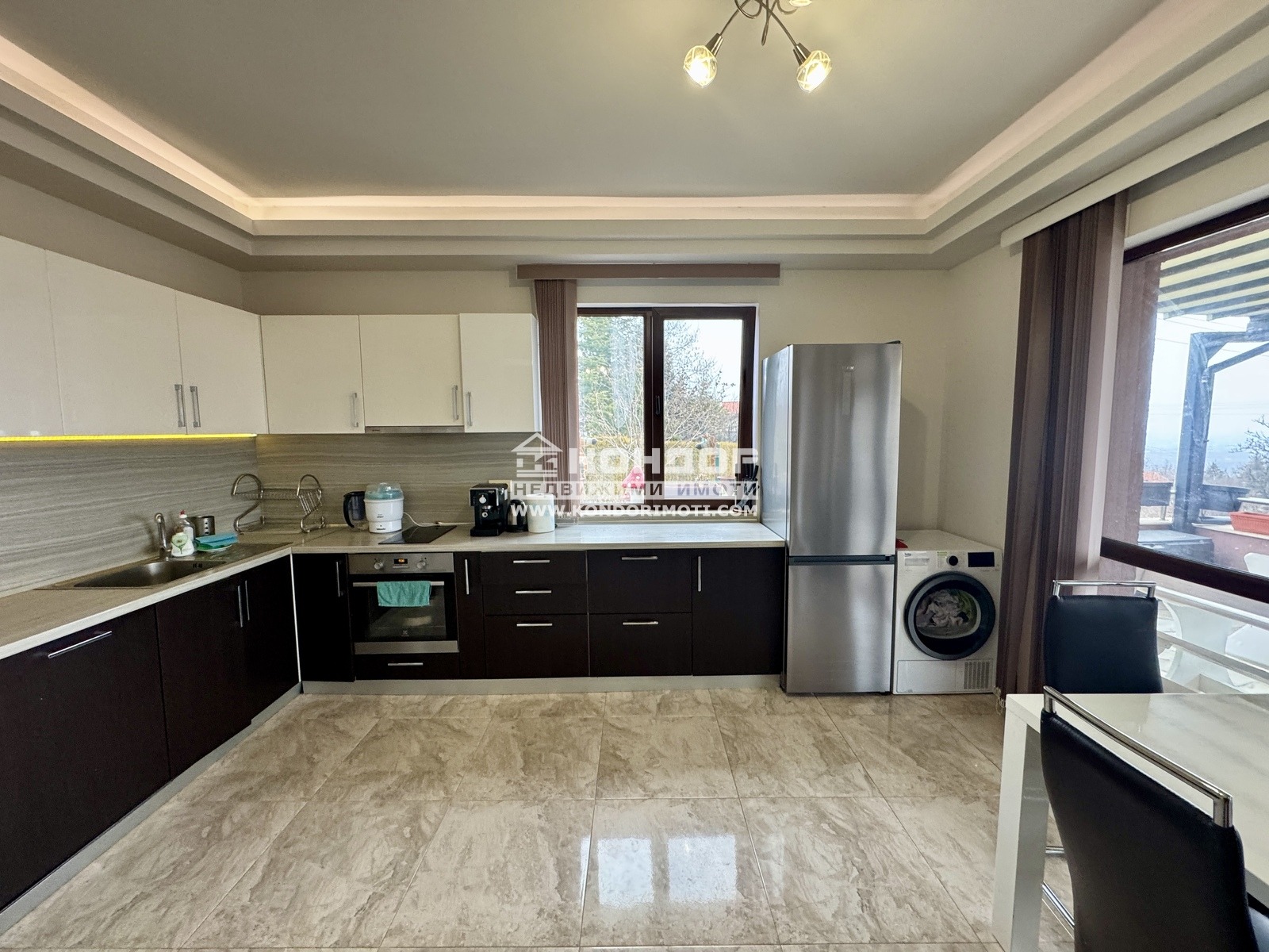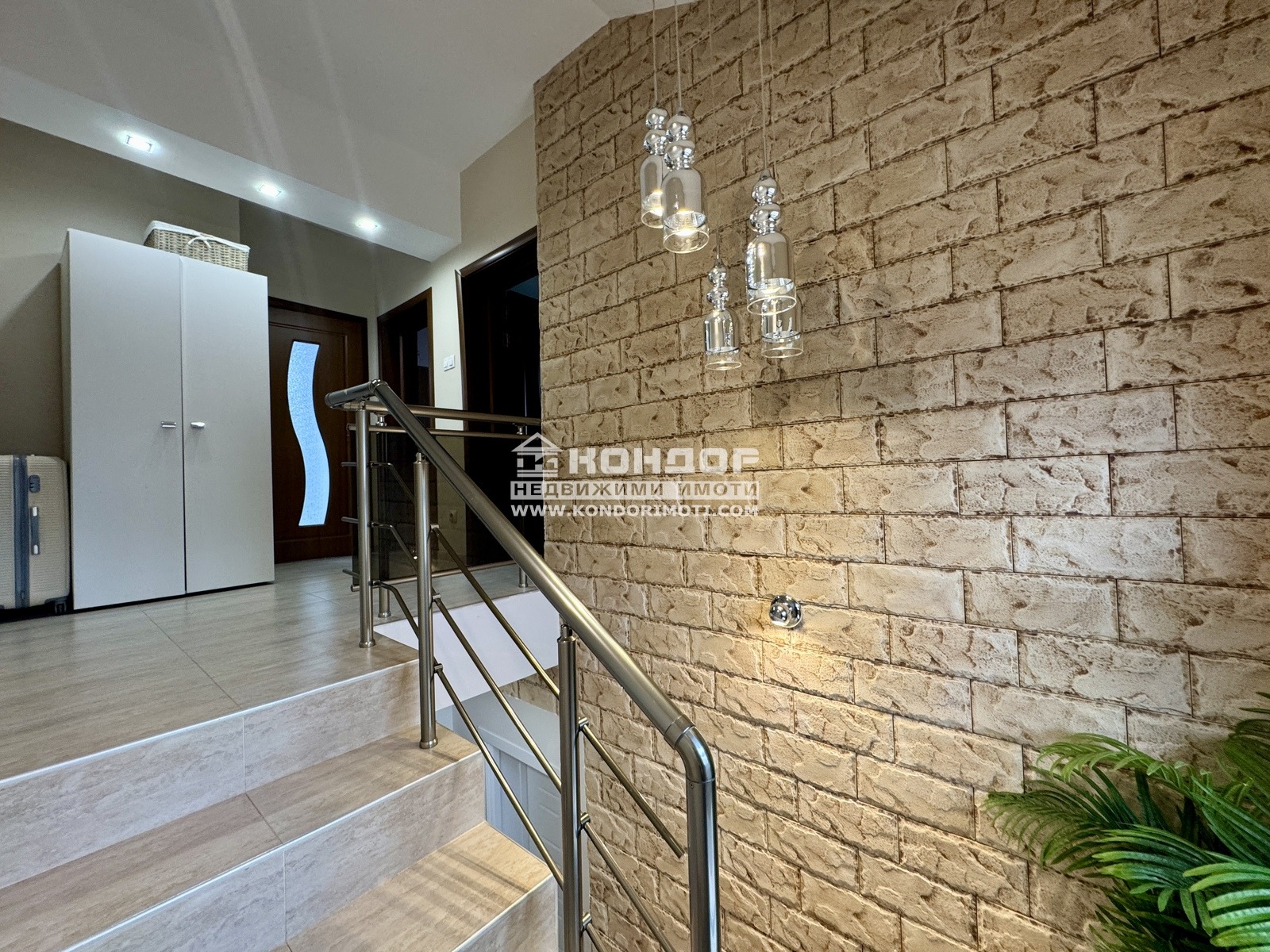 На първия етаж са разположени коридор, дневна с кухня и трапезария, която има излаз на широка и покрита веранда с електрическа пергола от която се открива прекрасна панорама. На нивото също така са ситуирани спалня, гардеробна и баня с тоалетна