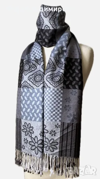 Черен шал от 70 % пашмина и 30 % коприна, кариран шал в черно, бяло и сиво, десен на цветя, листа и пепит, мек и топъл шал, нов, доставка с Еконт.