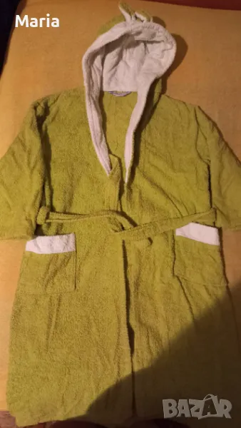 Детски халат за баня, зелено и бяло, с уши, 100 процента памук, Панагюрище, запазен, използван за кратко, защото го купихме точен размер и за година умаля, с нормални следи от пране. Размер 134 - 158