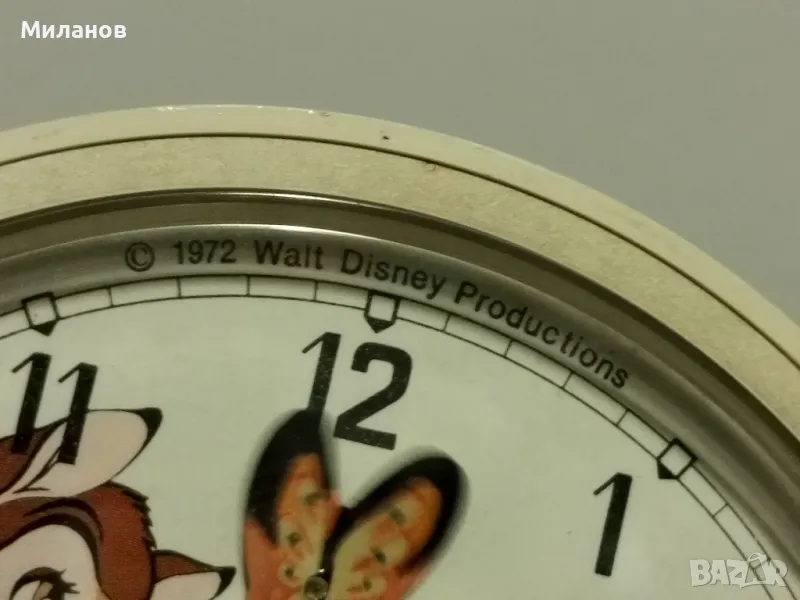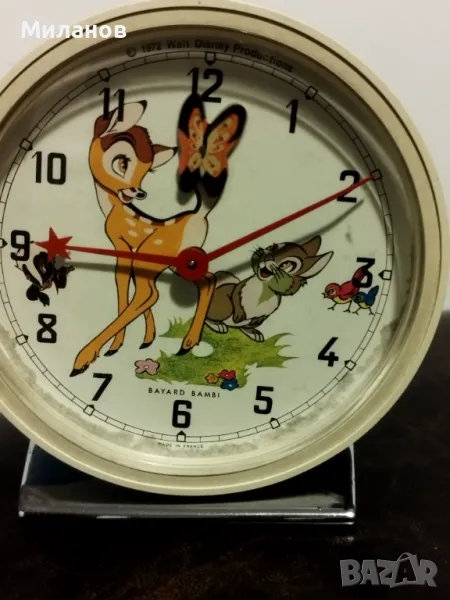 Стар френски анимиран будилник от 1972-ра година.Работи и звъни, в пълна изправност.Диаметър 115 милиметра.Номер на часовника-2304008