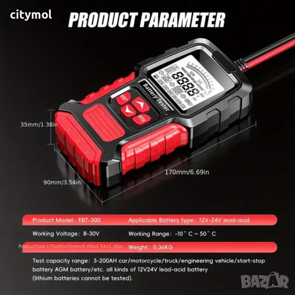Тест за здравето на батерията: Тестерът за батерии предоставя съвети кога да смените батерията чрез интелигентен анализ на здравето на батерията. Пригоден е за батерии 12V/24V. Съвместим с обикновени обслужваеми, AGM, EFB и GEL батерии