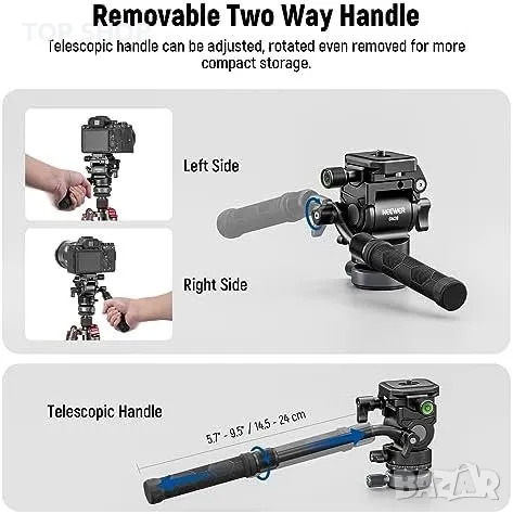 Телескопичната дръжка, с две секции, които се разтягат от 5,7" до 9,5" (14,5-24 см), предлага удобна и комфортна работа. Монтирайте я от двете страни на главата за флуиди с помощта на ръчно затягащото се заключване, като е подходяща както за левичари, така и за десничари.