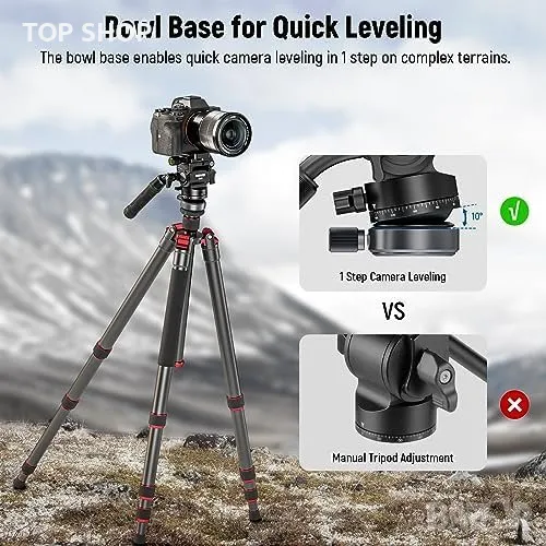 Вградената основа за нивелиране с диаметър 43 мм предлага регулиране на ъгъла ±10°, което осигурява бързо и точно нивелиране при неравен терен. Вграденият нивелир с балонче поддържа фотоапарата идеално прав.