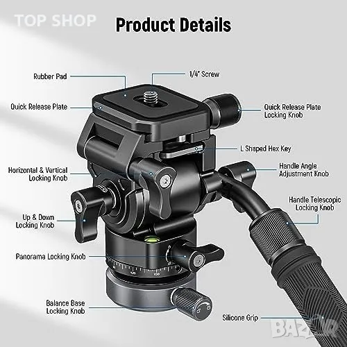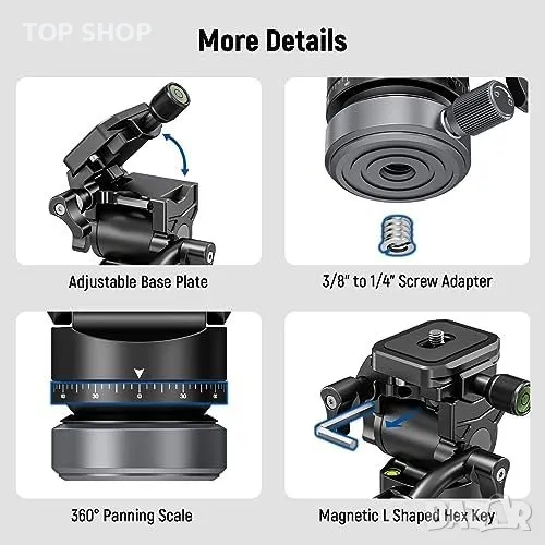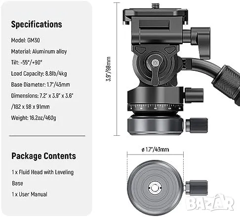 Въпреки компактния си размер - с височина само 3,9" (98 мм) и тегло 16,2 унции (460 г) - тази здрава флуидна глава от алуминиева сплав може да издържи значително максимално натоварване от 8,8 lb/4 kg. Тя е идеална за различни приложения, включително влог, пейзажна фотография, предаване на живо, портрети и др.