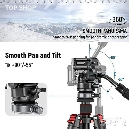 Тази флуидна глава разполага с фиксирано демпфериране на триенето за плавни движения, мащабирана основа за панорамни снимки на 360° и накланяне от -55° до 90° за заснемане на снимки под малък ъгъл и отгоре. Превключването между хоризонтално и вертикално снимане е безпроблемно благодарение на вертикалното заключване и плочата за бързо освобождаване.