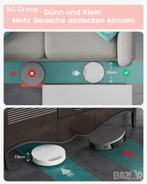 Малък дизайн на корпуса: Дизайн на корпус от една част с диаметър само 28 см и дебелина 7,9 см, специално проектиран за тесни пространства като легла, дивани и ъгли, за да се избегне захващане, с високо покритие и изключително нисък рейтинг на повреда. Дълъг живот на батерията с до 165 минути работа, автоматично връщане към станцията за зареждане след завършване на цикъла на почистване или когато батерията е изтощена.