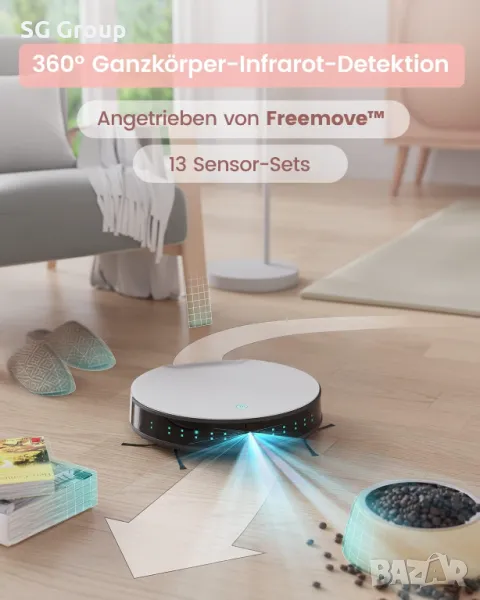 Технология FreeMove: Вграден 6D инфрачервен сензор против сблъсък вместо механичен сблъсък, всепосочно 720 градусово откриване на околната среда. Докато размерът на фюзелажа е намален, е по-лесно да се избягват препятствията и да се намалят повреди, причинени от леко износване, деформация, натрупване на прах и т.н. Може да открива стълби, за да избегне падане и лесно да се катери по килими.