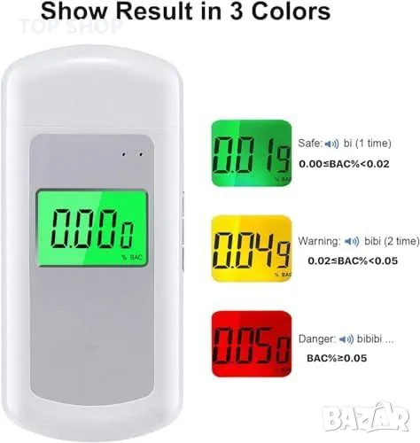 Мултиединична система: Възможност за настройка в 6 различни мерни единици, включително %BAC и mg/L.