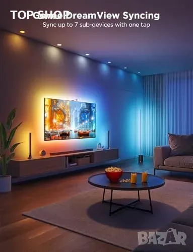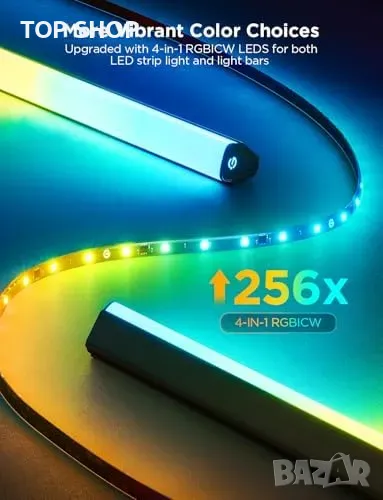 Комплект LED осветление за телевизор: Съдържа 11.8ft RGBICW лента и двойка 15” светлинни барове, идеални за 55-65” телевизори.