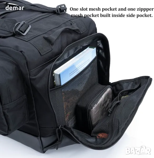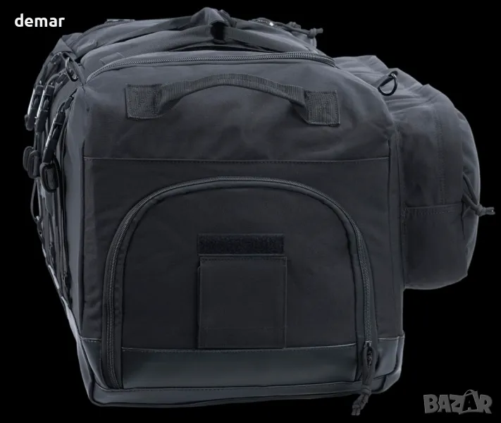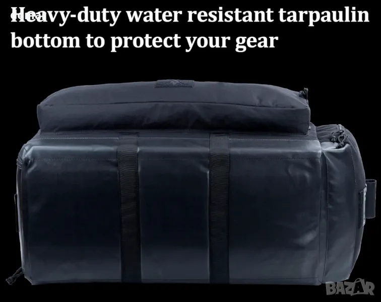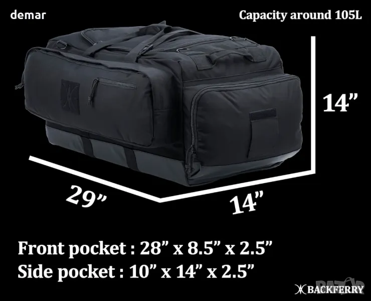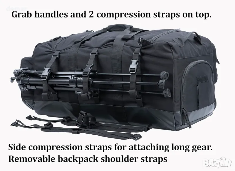Тази издръжлива раница тип чанта е изработена от издръжлив 600D полиестер с брезентово дъно за допълнителна защита. Разполага с просторно основно отделение (74 см х 36 см х 36 см), преден джоб с административен панел и мрежест джоб, страничен джоб със слот за ID и отделно странично отделение за обувки или мокри дрехи. Регулируеми, подплатени презрамки на раницата осигуряват комфорт, докато три подсилени дръжки за хващане позволяват бързо боравене. Компресионните ленти закрепват екипировката и побират по-дълги предмети. Включен е дъждобран за мокри условия, а дизайнът с меко дъно предлага гъвкавост без вътрешна вложка. Преден страничен джоб: 71cm x 22cm x 6cm. Страничен джоб: 26cm x 36cm x 6cm.