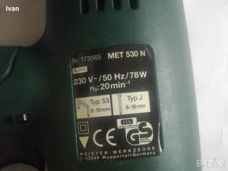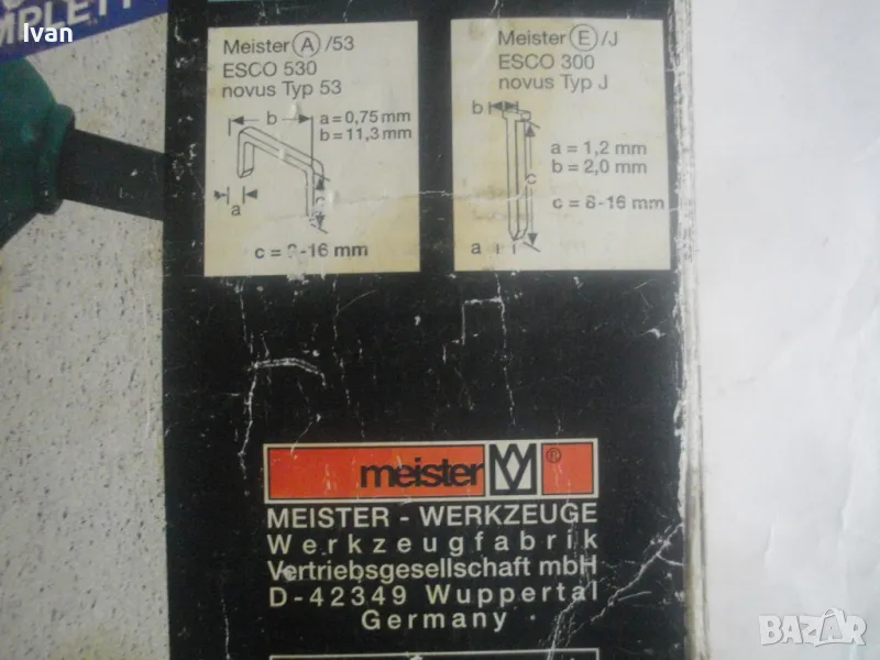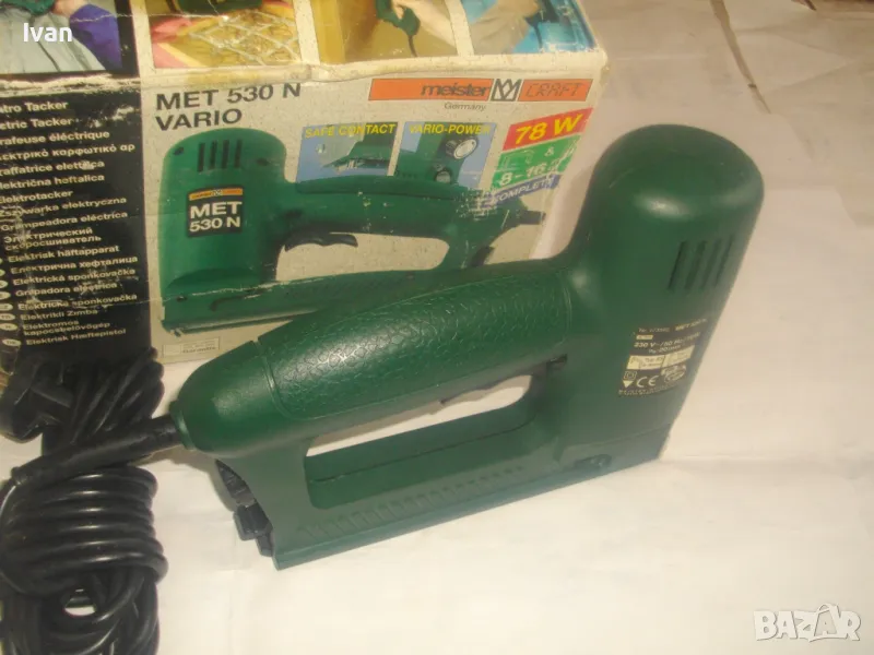 ОПИСАНИЕ на КОМБИНИРАН такер зелен Мейстер. Цена 199 лв. Нов, неизползван и неупотребяван. Отлично техническо/работно състоняие. Марка и модел Meister MET 530N. Производител - Meister Craft. Производство - оригинално Германия - Germany. За консумативи скоби и пирони игли размер 8-16 мм. Мощност 78 вата, функция заключване на удара, регулатор на мощността. Размери на такера 180 мм х 165 мм х 50 мм. Оригиналната немска картонена кутия на марката и модела.