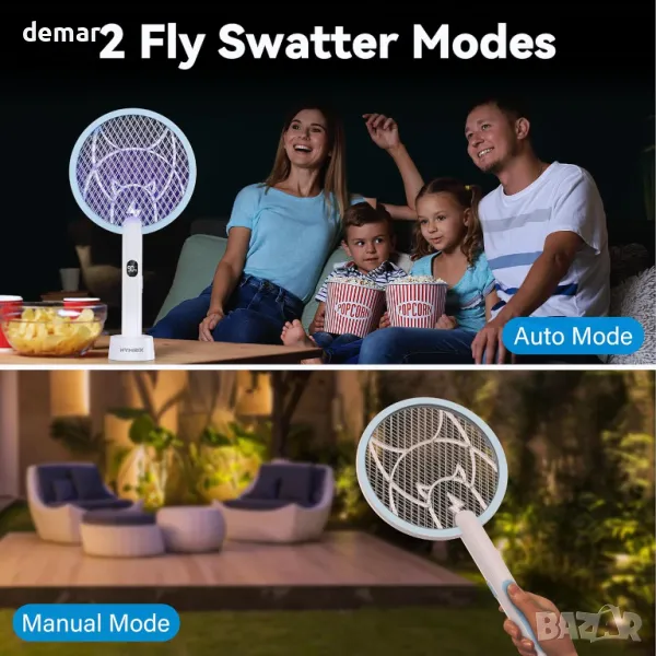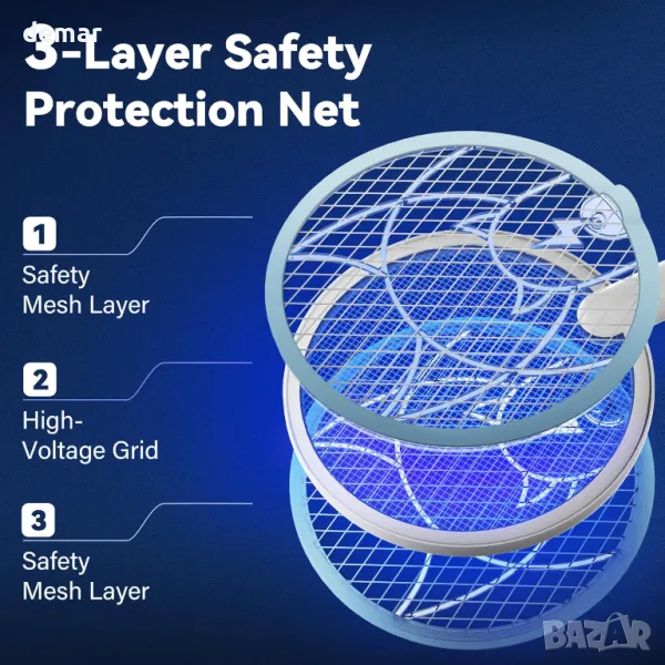 Този високоволтов уловител за комари елиминира насекомите при контакт, функционирайки както като ръчна ракета, така и като автоматичен капан с лилава светлина за тиха употреба през нощта. Оборудван с двоен Type-C порт за зареждане и 1800mAh акумулаторна батерия, той предлага гъвкаво зареждане и по-дълга работа. Дисплей за нивото на батерията осигурява лесно наблюдение, докато 3-слойната защитна мрежа повишава безопасността, като предотвратява случайни удари.