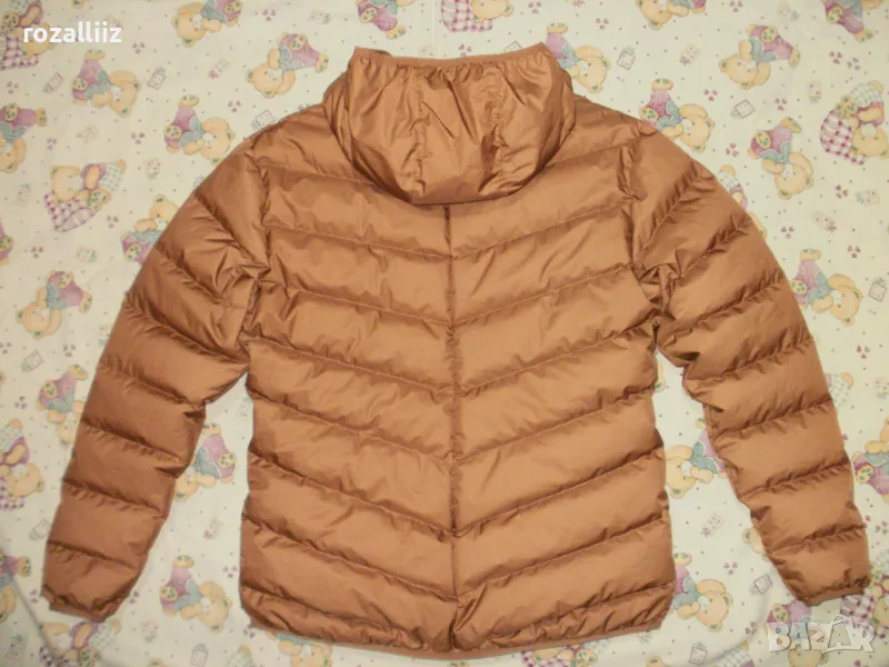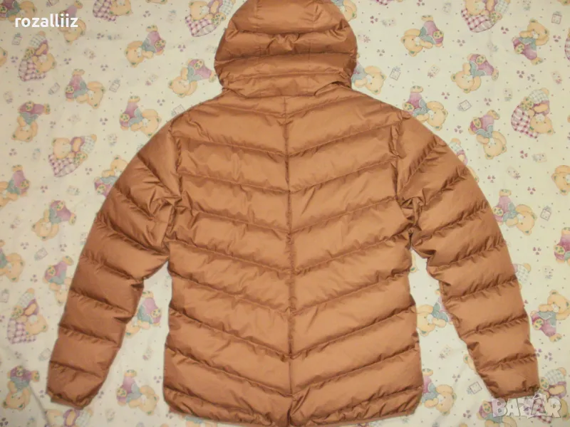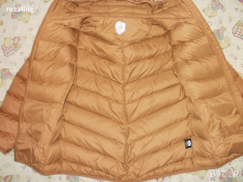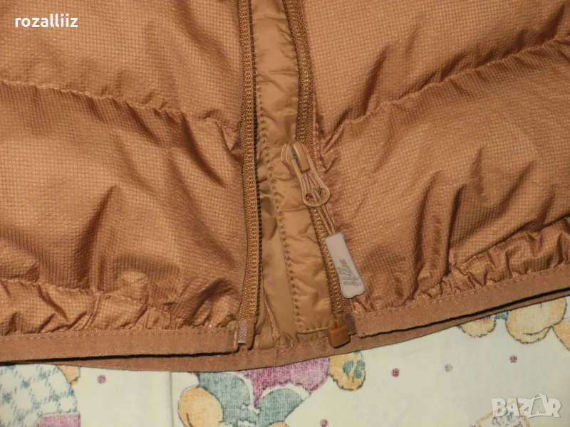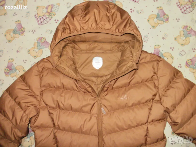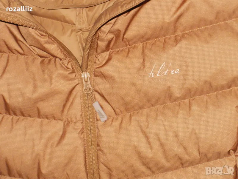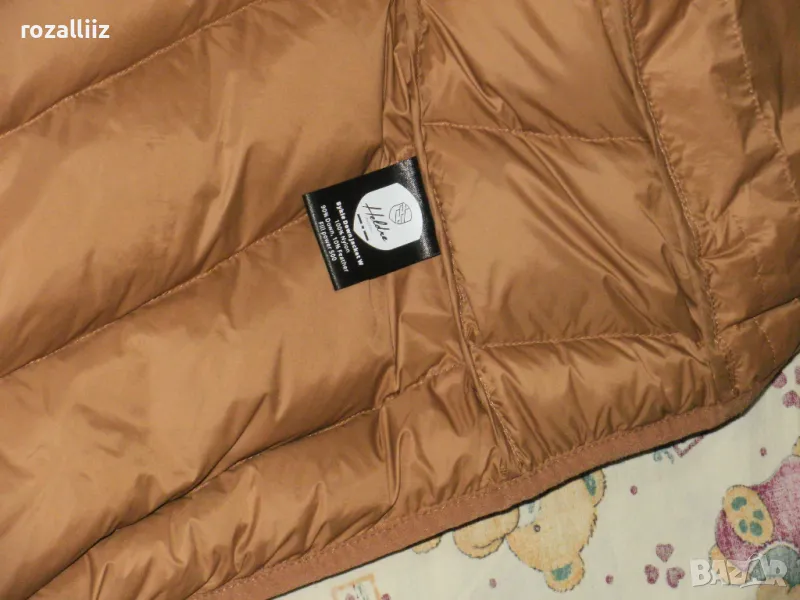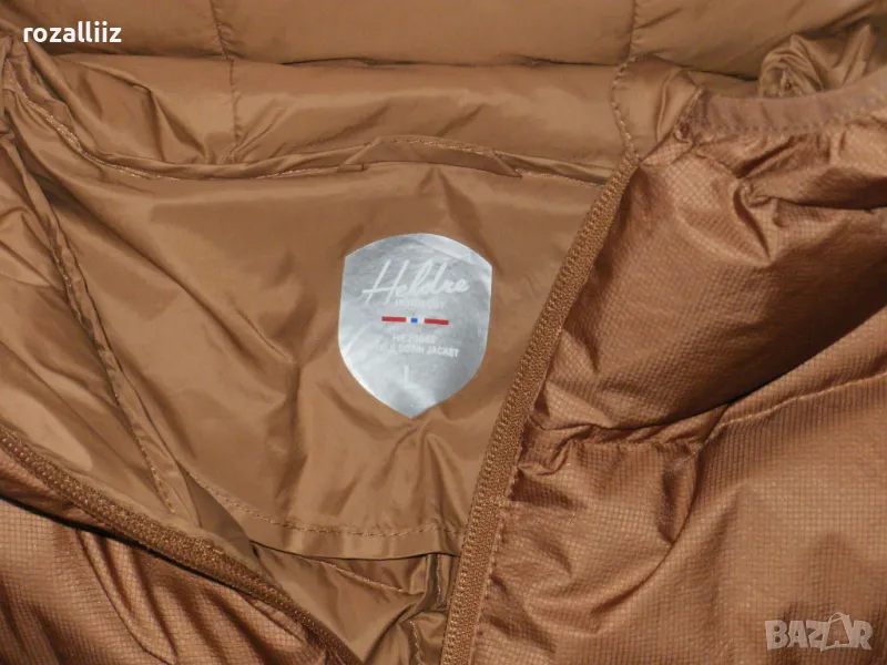 Якето е на HELDRE, оригинално, обличано, без забелижки. По номер е L, цвета е карамел. Пълнежа е 90% пух и 10% пера. Вталена кройка е, отпред има два джоба с ципове и два вътрешни. Има лого отпред и на всички ципове. Отпред е по късо. Не е от най тънките, материята е от по плътните.