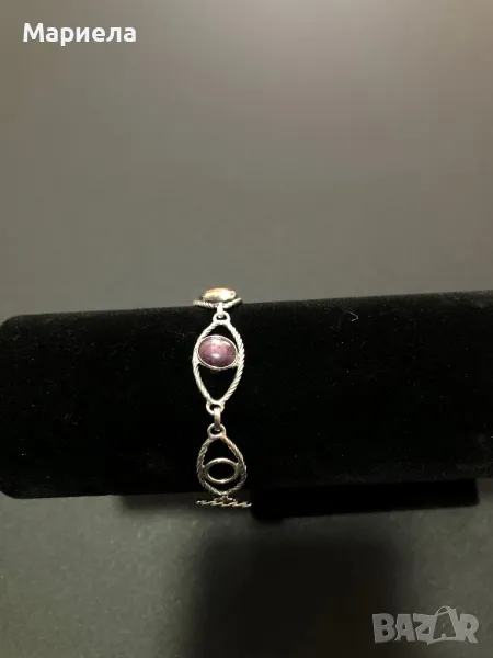 Авторска сребърна гривна с лунен камък, слънчев камък и натурален рубин, изцяло ръчна изработка, проба 925, 18см дължина