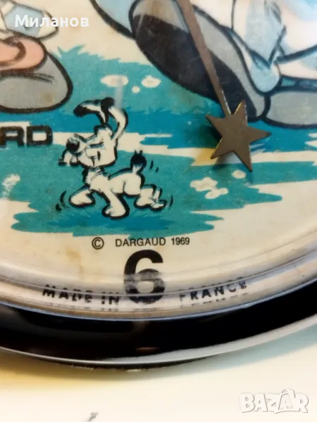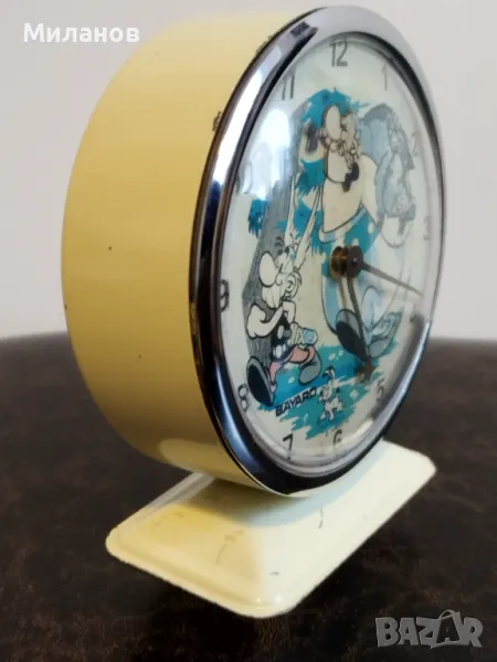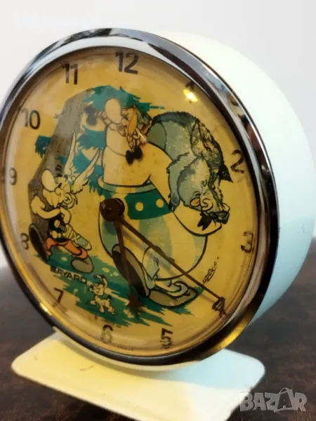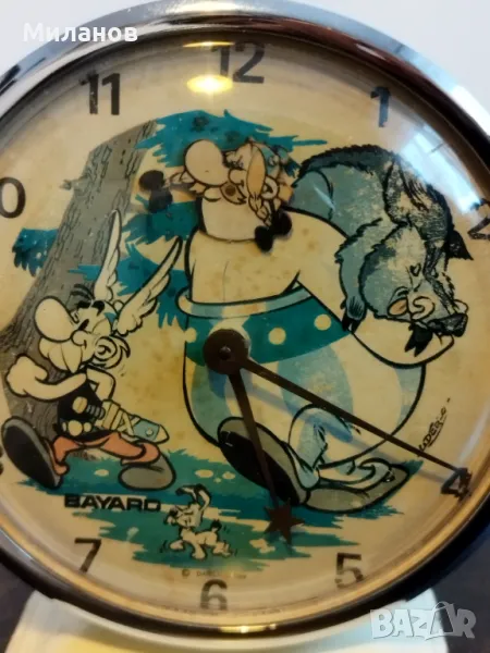 Стар механичен анимиран френски будилник Баярд, от 1969-а година.Работи и звъни, главата на Обеликс се клати.Диаметър-113 милиметра.Номер на часовника 3640987