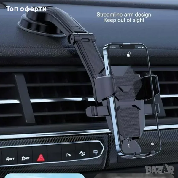 Универсална стойка за телефон с вакуум и удължено рамо, за по-добра видимост.