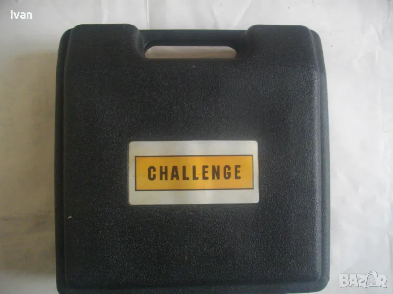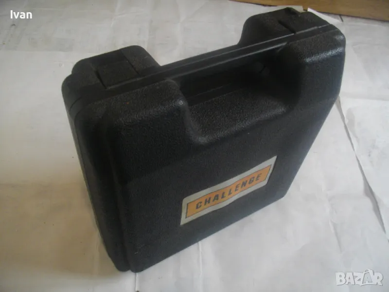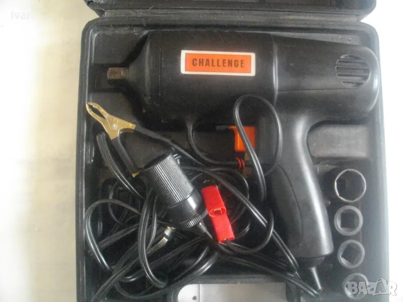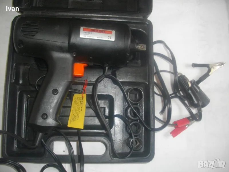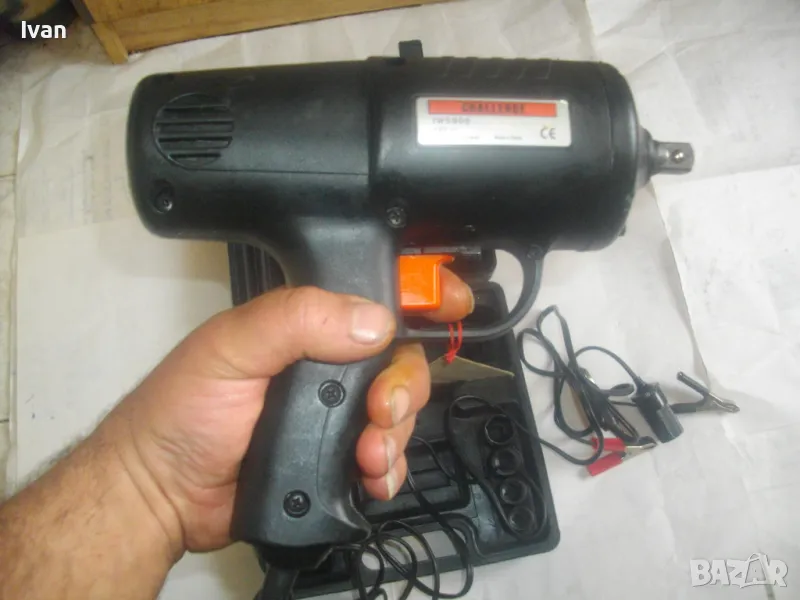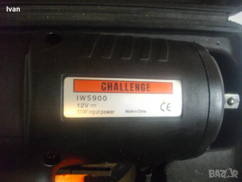Съвсем нов силен и мощен гайковерт-с размер на квадрата за камъни-1/2.Английска марка,производство-базирано в Китай,.Марка и модел на машината-Challenge IW5900.Пълен комплект,в отлично техническо състояние.Работи много добре.Силен,мощен,ефективен.Мощност на мотора-12 волта,50 вата.Реверс смяна посока.Плавен старт на спусъка-шпиндел.Светлинен Лед прожектор-просветка.Вграден кабел около 5 метра дължина със завършващ накрайник-букса за включване към запалката на автомобил,камион.Отделно има и накрайник за включване към клемите на акумулатор.В комплекта има и 4 броя камъни-накрайници,от хром-ванадиум,размери-17мм-19мм-21мм-23мм.Комплекта е прибран в оригиналният си твърдосплавен пластмасов куфар с фабричното лого.