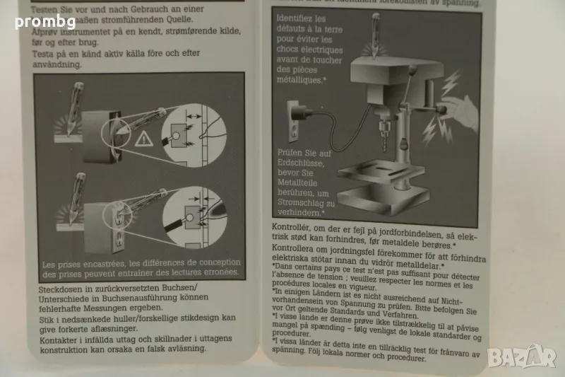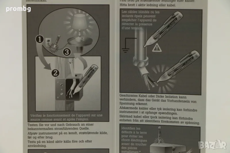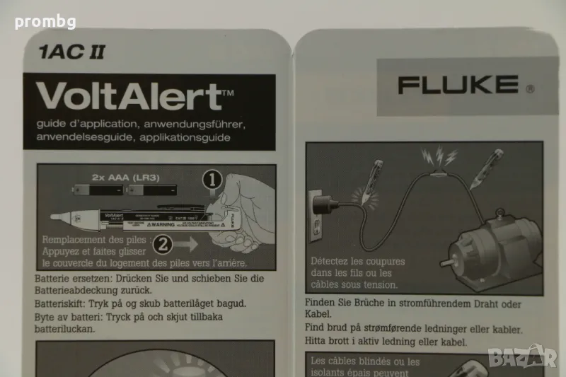 Fluke, Германия. Производител Fluke - Холандия. Работи, чрез безконтактно отчитане на напрежението. Когато се доближи върха до проводник или устройство под напрежение, уредът става червен и издава звуков сигнал. Има функция за самоконтрол. Това показва готовността за работа като през няколко секунди премигва червена светлина. CAT IV 1000 V за допълнителна защита. Обхват на отчитаното напрежение от 200 V до 1000 V AC. Чрез уреда може да се открие точното място на прекъсване на верига. Работи с батерия 2x AAA /вкл./. Тегло 95 гр.