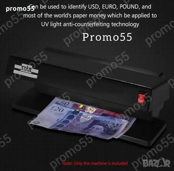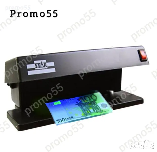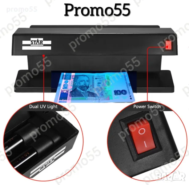 Преносима машина - детектор за фалшиви банкноти, оборудвана с двойни UV светлини с превключвател за включване/изключване.