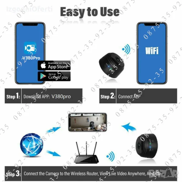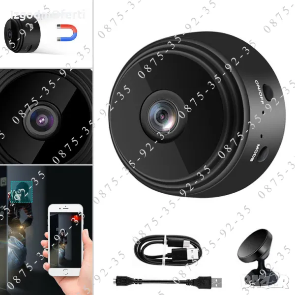 Чисто нови висококачествени безжични (WiFi) мини Full HD камери работещи с приложението V380 PRO. Много малки скрити IP камери / шпионски / охранителни / бебефон Wireless камери с детекция на движение, със голяма собствена батерия и с възможност за запис на звук, запис на FullHD видео и правене на снимки с висока резолюция. Камерите имат вградена батерия 400 mAh, микрофон, инфрачервени LED диоди за работа в НОЩЕН режим и имат възможност да правят запис върху micro SD (TF) карта и да се свързват и управяват от телефона през безплатно приложение. След като засече движение, камерата ще изпрати Push Notification на вашия телефон. Освен това може да влезете в приложението по всяко време, за да видите какво се случва в реално време и никога да не се притеснявате, че ще пропуснете нещо важно. Камерата има вграден hotspot и може да се наблюдава от телефона, дори без наличие на интернет връзка. В комплекта е включена и стойка със силен магнит за сигурно закрепване.