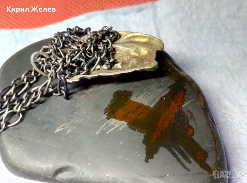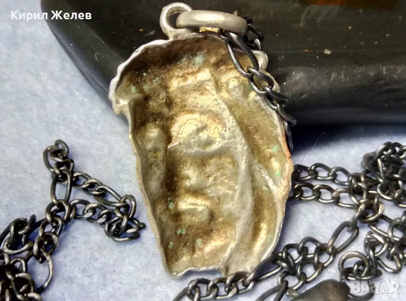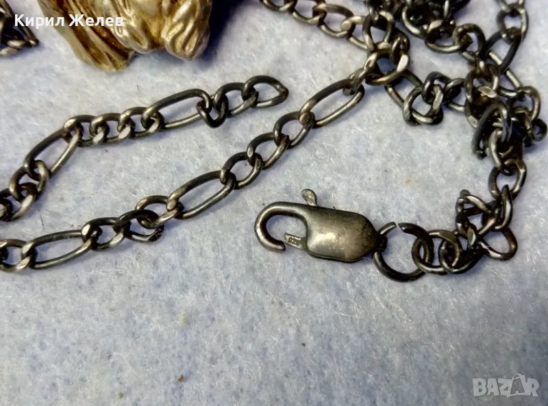 ХУДОЖЕСТВЕНО РЪЧНО ИЗРАБОТЕН от СРЕБРО ВИСОКА ПРОБА, с МАЛЪК ПРОЦЕНТ БЛАГОРОДНА СТОМАНА в СПЛАВТА /ЛЕКО го ЛОВИ СИЛЕН МАГНИТ!/, КОЕТО е РЯДКА БИЖУТЕРСКА ТЕХНОЛОГИЯ! ТЕСТВАН е ПРОФЕСИОНАЛНО - и в ДЪЛБОЧИНА, и КАТЕГОРИЧНО МАТЕРИАЛЪТ е ВИСОКА ПРОБА СРЕБРО! ЗАКОПЧАЛКАТА на СИНДЖИРЧЕТО се НУЖДАЕ от ЛЕК РЕМОНТ! / Пускам голяма СЕРИЯ от майсторска ръчна изработка старинни и нови СРЕБЪРНИ БИЖУТА - пръстени, обеци, медальони, гривни, ланци, колиета, брошки - някои са инкрустирани със скъпоценни или полускъпоценни камъни. Всичките са ТЕСТВАНИ ПРОФЕСИОНАЛНО върху лидийски камък с пробер - киселина за сребро, като особено по-старите, ръчно изработени и без маркировка които са, е заснето и резултата на камъка - яркочервеният цвят при натъркване и капване на киселината показва, че са от масивно СРЕБРО ВИСОКА ПРОБА. Има и накити от САЧАН /нископробна сребърна сплав, с която са работели старите майстори - куюмджии от периода на ВЪЗРАЖДАНЕТО и края на 19-ти век/, мед, бронз и благородна стомана с позлата или посребряване. Снимките ги ОНАГЛЕДЯВАТ! Имам НАД 27000 обяви в профила си - За ВСЕКИ по НЕЩО...! Изпращам по Еконт или Спиди с опция Преглед/Тест и отстъпка-транспорт.