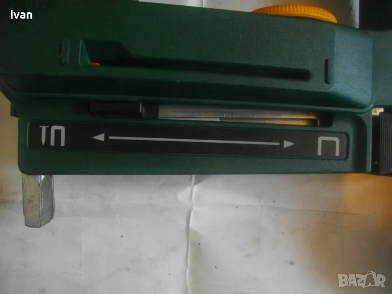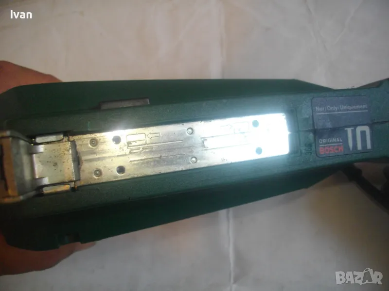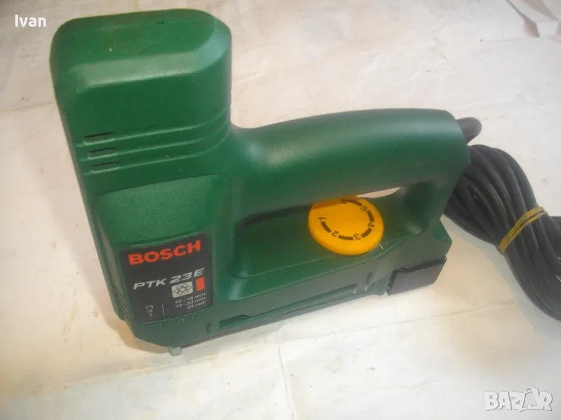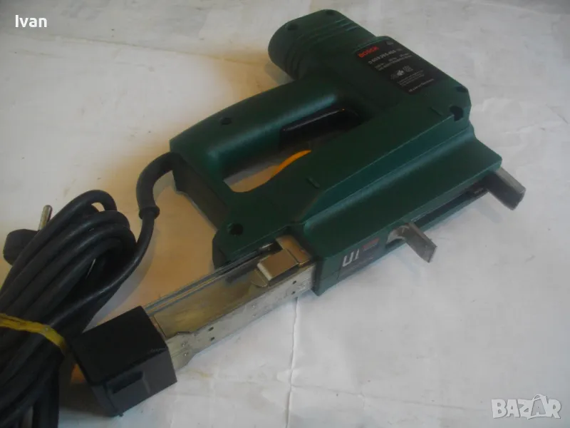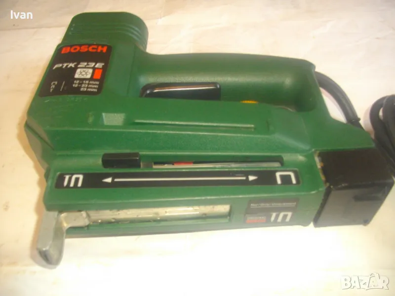 електрически такер, оригинален немски модел на Бош. Комбиниран за скоби два различни типа размери 12-23 мм и пирони размер 23 мм. Регулация силата на удар потенциометър 6 степени.