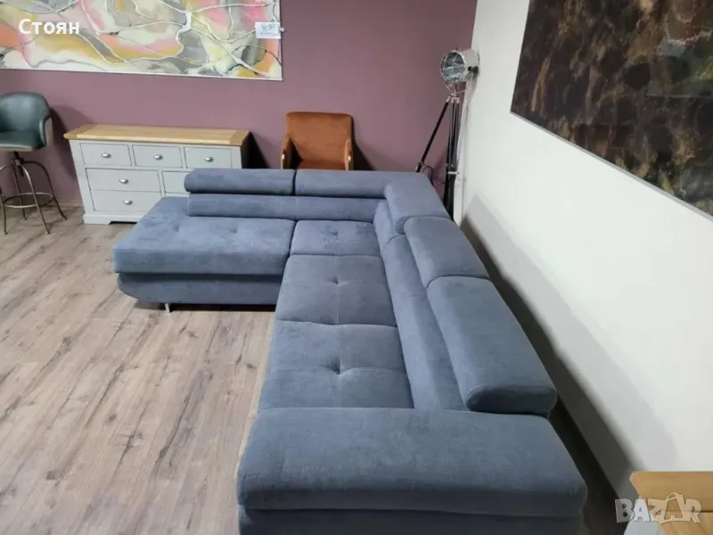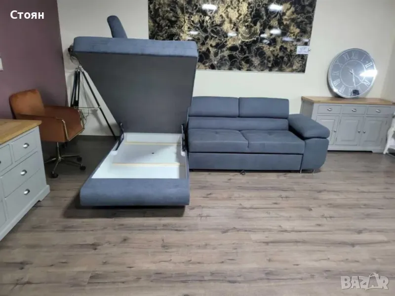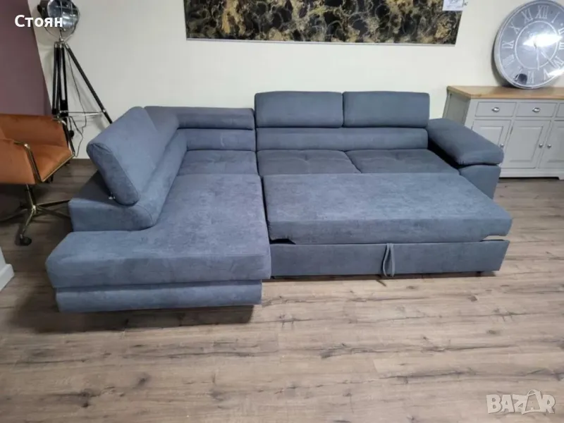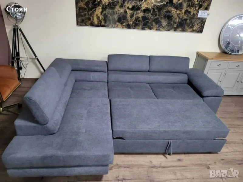 Сив ъглов диван от плат с фунция сън и ракла.