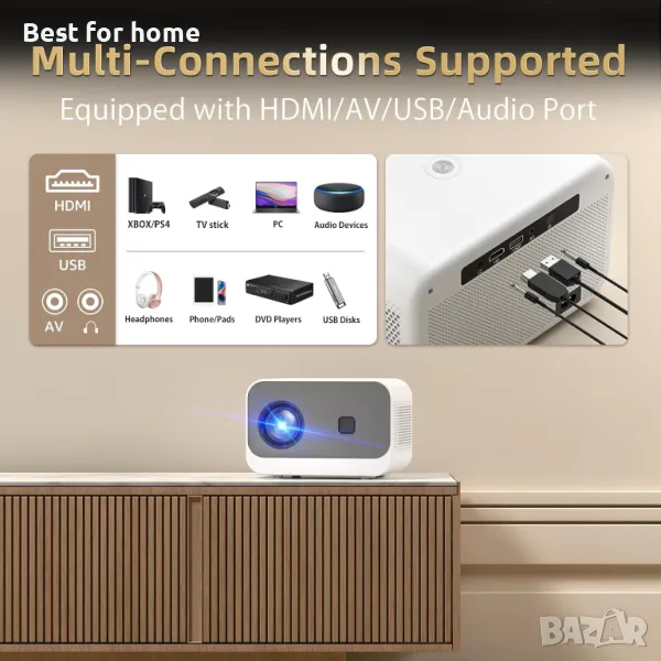 👍[Широка съвместимост + Дизайн за защита на очите] В допълнение към безпроблемното поточно предаване с Miracast, iOS, DLNA и Airplay свързаност, 4K проекторът има и HDMI/AV/USB входове, съвместими с лаптопи/TV памети/смартфони/USB плейъри/DVD плейъри и различни устройства като PS3/PS4/външни високоговорители. Независимо дали презентирате, възпроизвеждате или гледате любимите си предавания, този малък проектор отговаря на нуждите ви от стрийминг с ярки цветове.