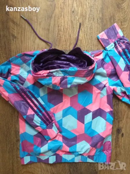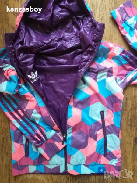 Adidas Originals - дамско двулицево горнище р-р S, в много добро състояние, единствената забележка е малка дупка от изгорено на качулката показана на последната снимка, точни размери: ширина подмишници - 45, дължина - 54см, дължина на ръкава - 60см